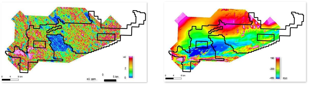 Figure 1: Airborne radiometric equivalent uranium (eU, ppm) and residual magnetic intensity images highlighting priority target areas.