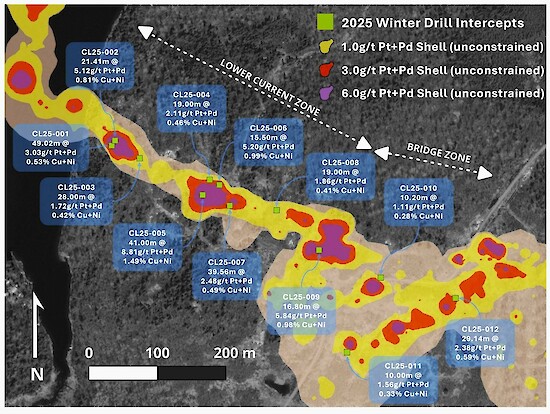 Figure 1. Plan view map showing locations of high-grade intercepts of the 2025 Winter Drilling Program at the Current Deposit.