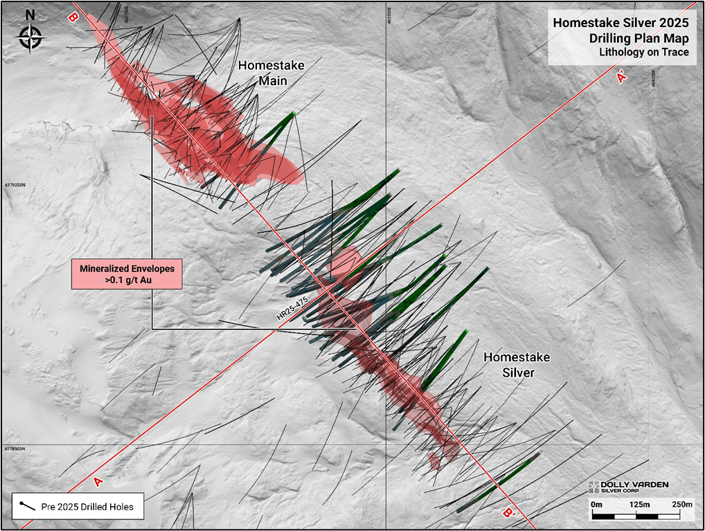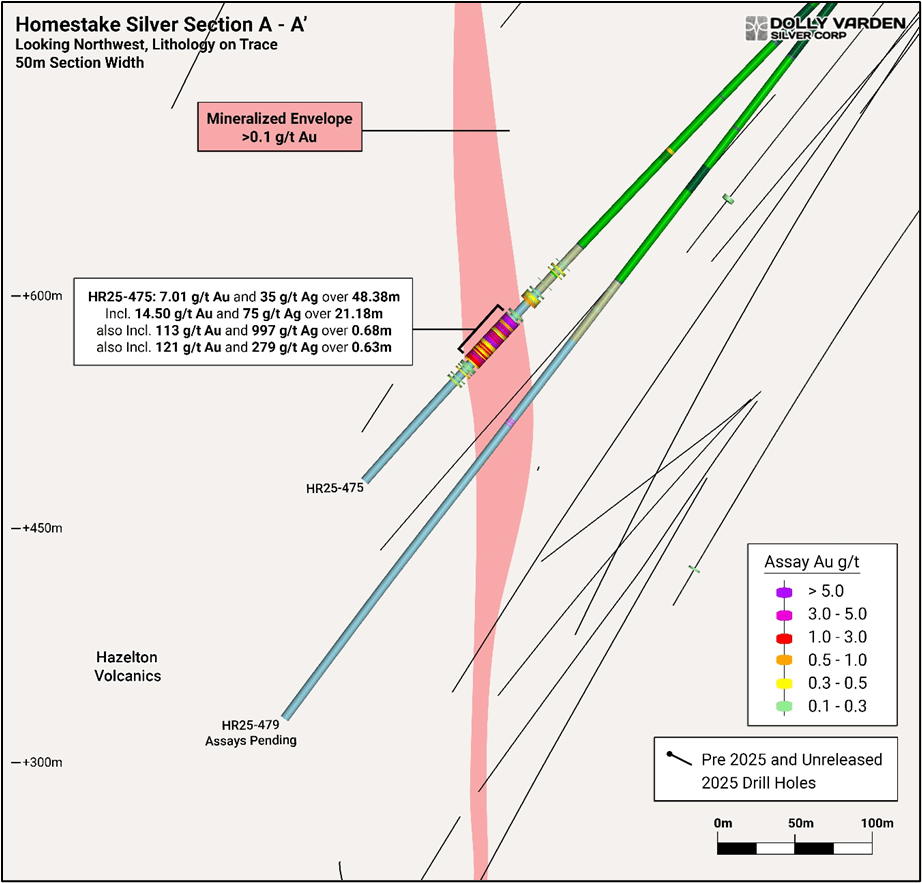 VANCOUVER, BC, December 4, 2025, Dolly Varden Silver Corporation (TSX-V: DV | NYSE MKT: DVS | FSE: DVQ) (the “Company” or “Dolly Varden“) is pleased to report results from drilling that expands the high-grade gold mineralized plunge within the Homestake Silver deposit. Drill hole HR25-475 is a step-out 42 meters to the north and on the upper edge of the shallowly northerly plunging, high grade trend. The intercept grades 14.50 g/t Au and 75 g/t Ag over 21.18 meters, including 113 g/t Au and 997 g/t Ag over 0.68 meters and 121 g/t Au and 279 g/t Ag over 0.63 meters. The high-grade mineralization in HR25-475 is hosted within a broader mineralized zone grading 7.01 g/t Au and 35 g/t Ag over 48.38 meters.