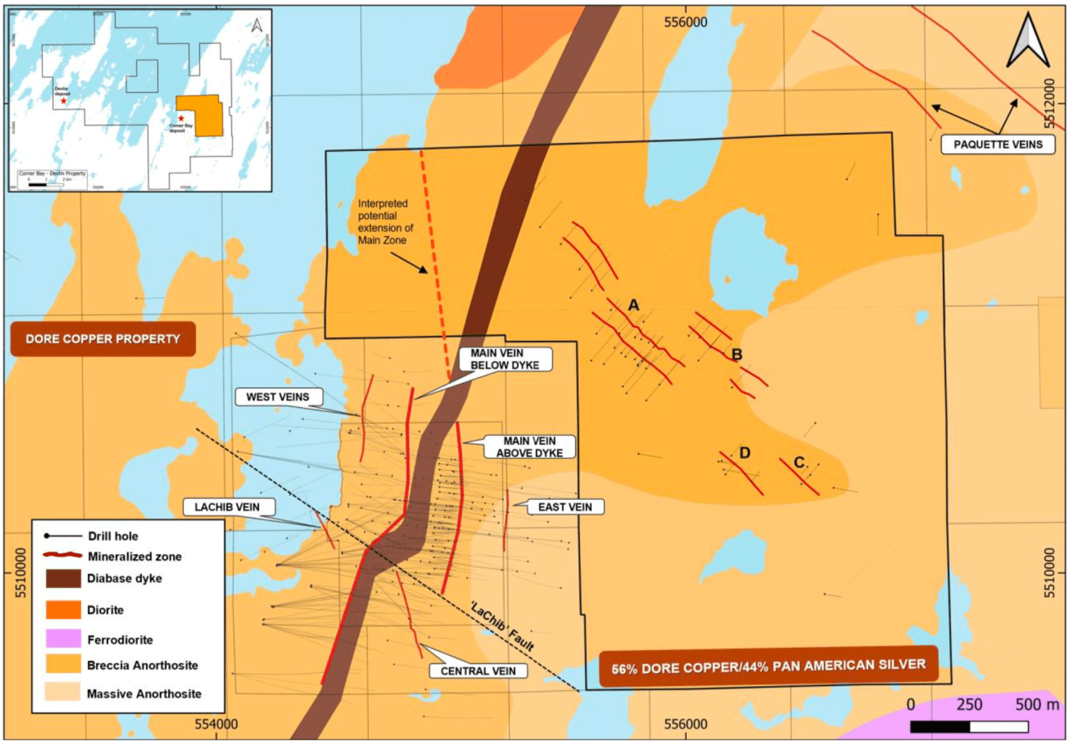 The Claim Group totals 17 claims covering an area of 446 ha within Dore Copper’s 100% owned Corner Bay-Devlin Property (5,446 ha) (Figure 1). The Claim Group has seen historical exploration during the 1970’s with 36 diamond drill holes totaling approximately 7,610 meters. Further exploration activities was carried out by SOQUEM between 1992 and 1998 with 28 diamond drill holes totaling 5,327 meters.