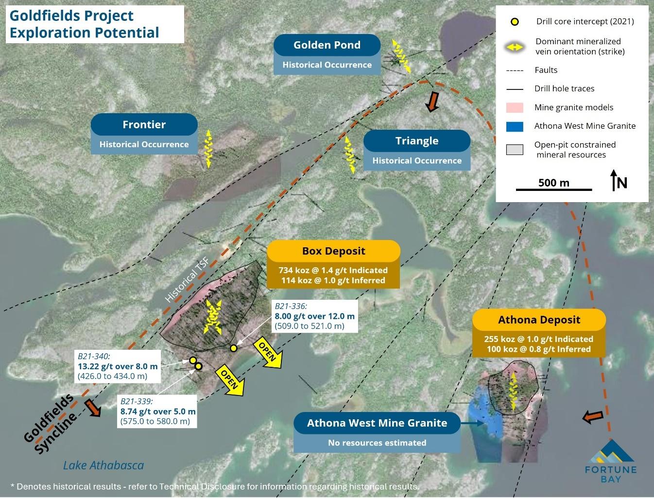 The 100% owned Goldfields Project (“Goldfields” or the “Project”) is located approximately 13 kilometres south of Uranium City, Saskatchewan. Goldfields hosts the Box and Athona gold deposits, as well as additional gold showings within the prospective Goldfields Syncline. The Box deposit was historically mined underground between 1939 and 1942, producing 64,000 ounces of gold. The Project is located within a historical mining area and benefits from established infrastructure, including a road and hydro-powerline to the Box deposit. Nearby facilities and services in Uranium City include bulk fuel, civils contractors, and a commercial airport.