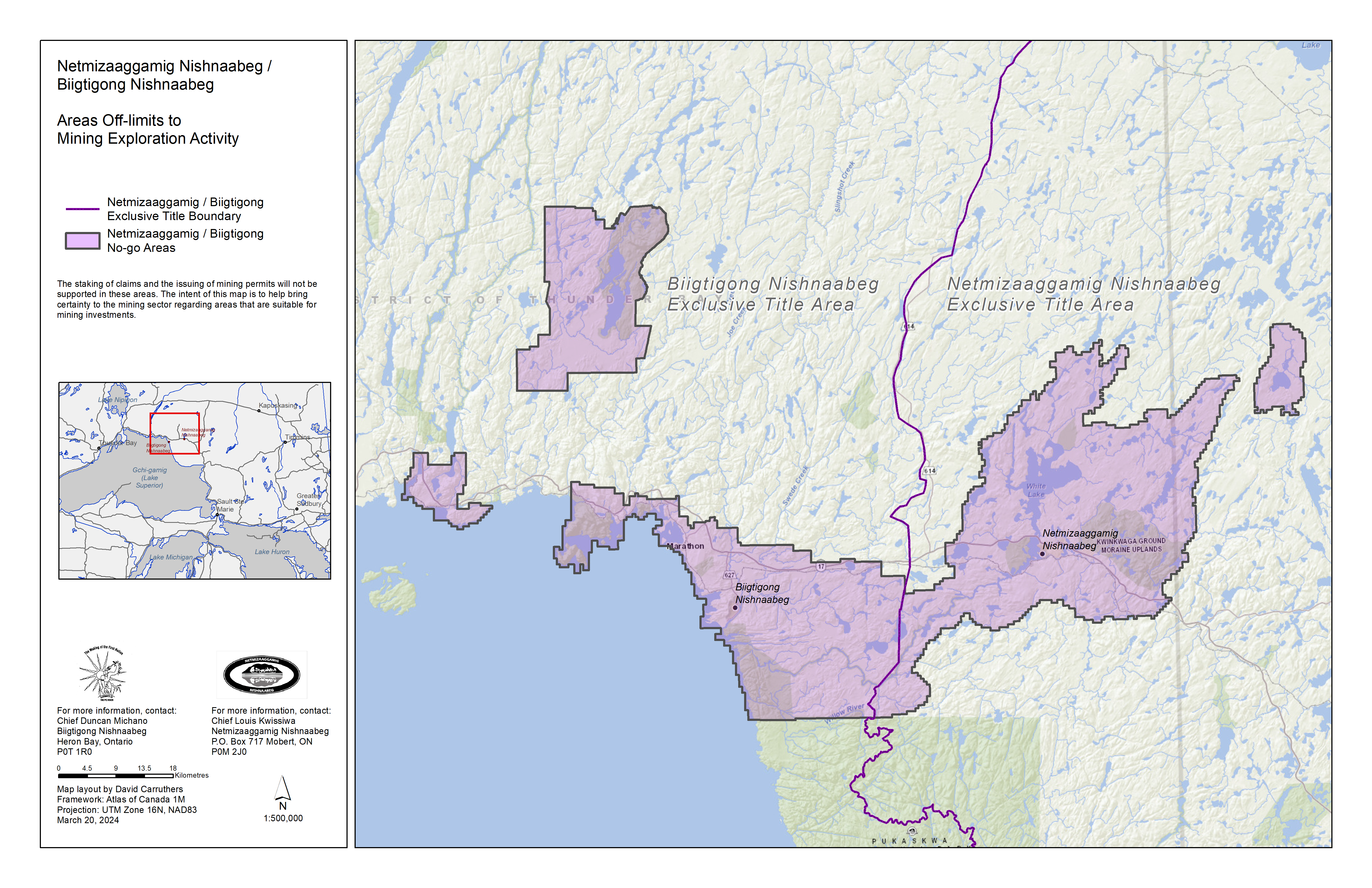This is a public notice that Netmizaaggamig Nishnaabeg (NN) and Biigtigong Nishnaabeg (BN) have identified areas north of Lake Superior that are off-limits to mining exploration and development.