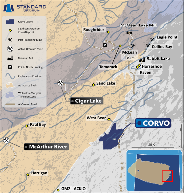 Figure 1. Regional map of the Corvo Project. The Project is located 60 km due east of Cameco’s McArthur River mine and 45 km northeast of Atha Energy’s Gemini Mineralized Zone (“GMZ”).